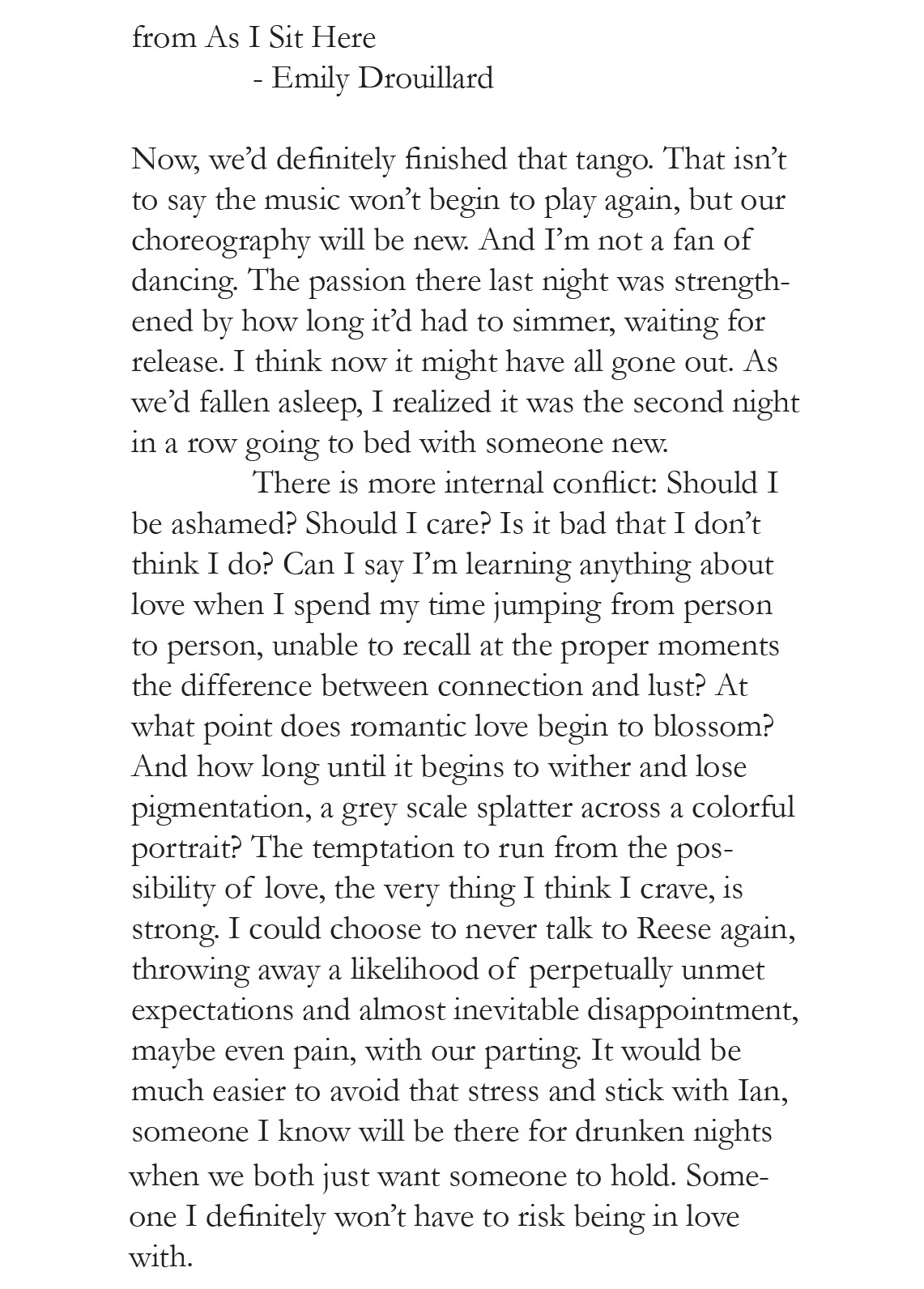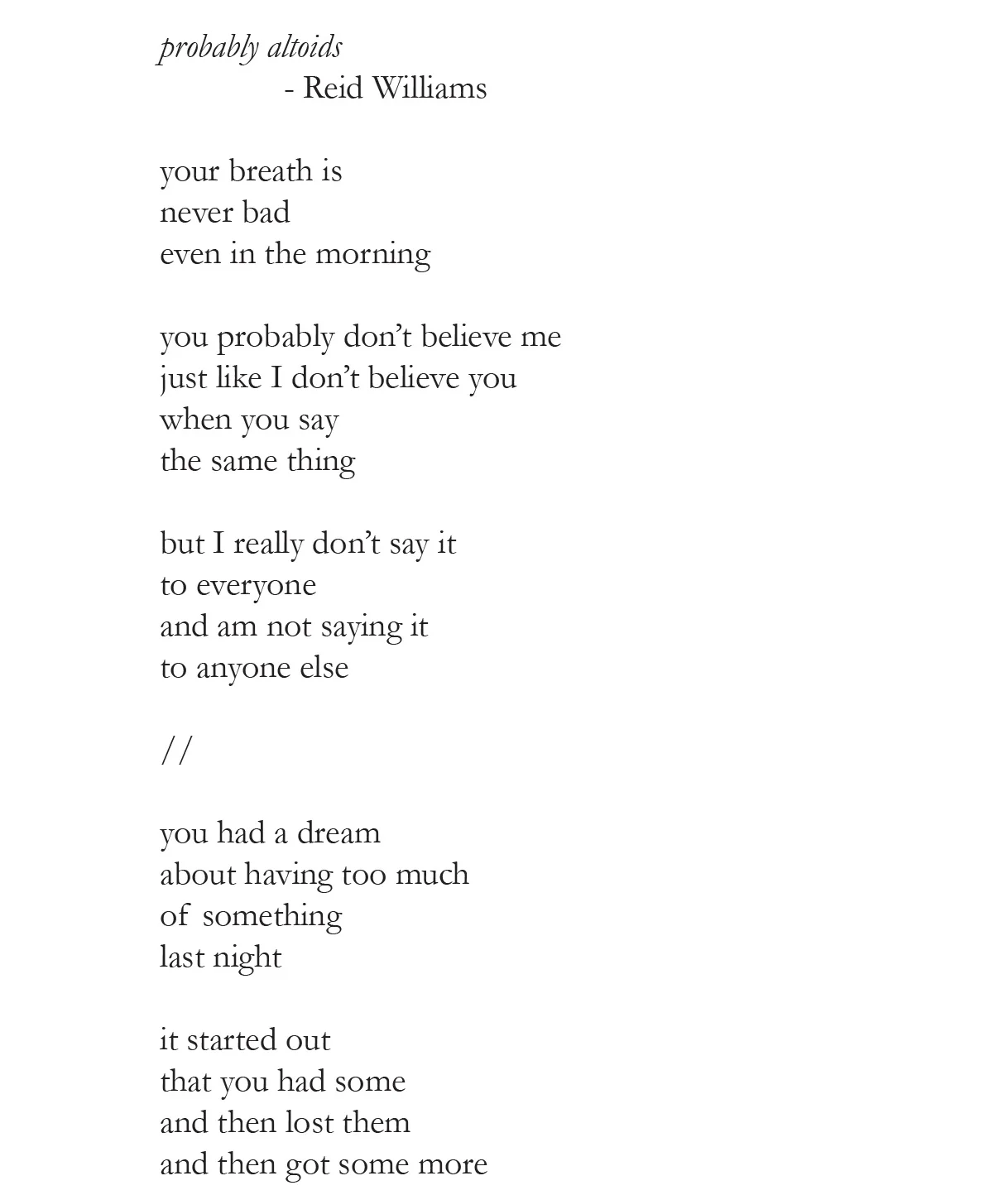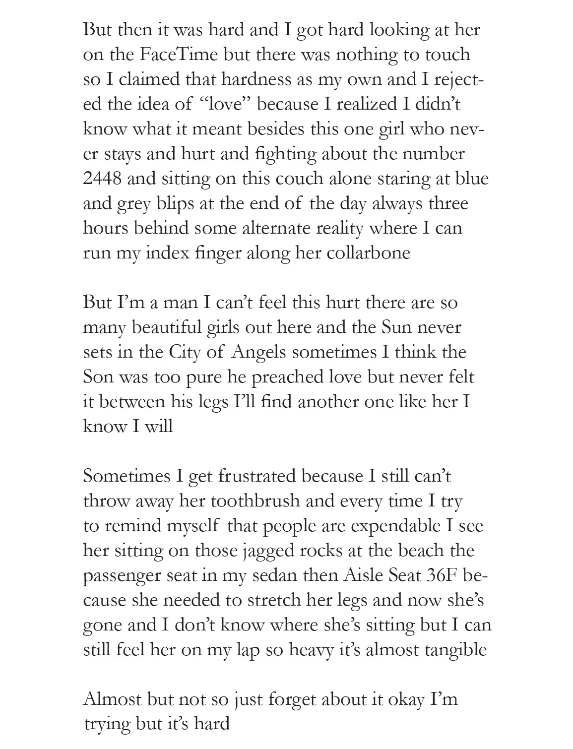 I found Reid Williams on Instagram. There was a filterless photo of him, cigarette hanging out of his mouth next to a picture of a woman in bunny ears. What really got my attention was the caption displaying the title of his zine, PLAY(ed) Boy. From one media form to another, I turned to Google. Growing up in a world where the internet is my zine, I was intrigued what I would find. A free download later, I came upon fifty-two pages of poems about unconventional heartbreak from the voices we don't hear from enough. It was genuine and honest and not like anything I had read before. At a state school in Pennsylvania, I'm use to the emotionless macho male. The less attachment you have the more attractive you are. PLAY(ed) BOY let me see that there is always an attachment, even when you don't think there is.